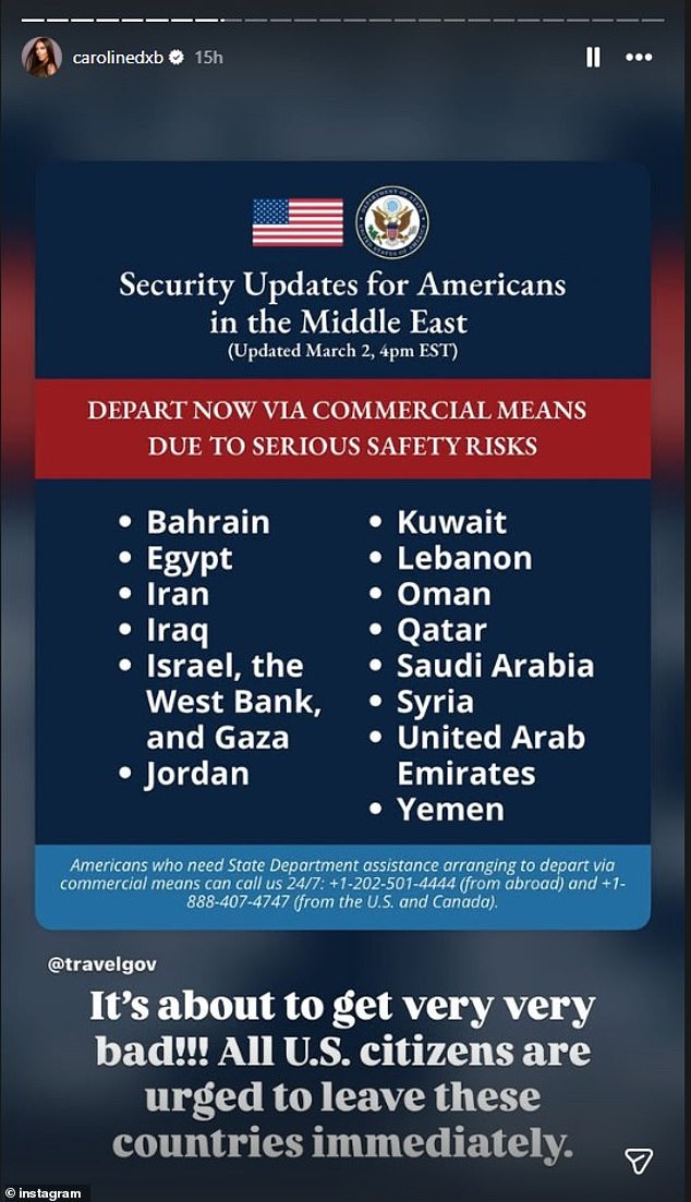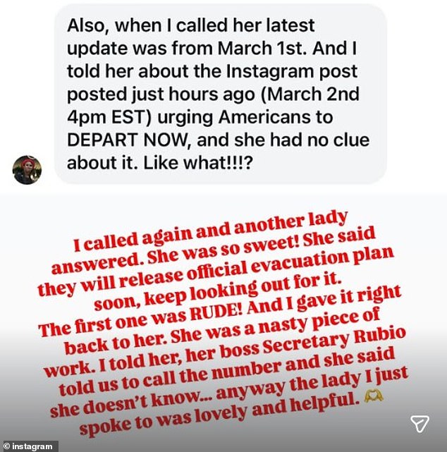 ‘Marco Rubio do something because everyone is confused telling us to evacuate VIA coordinating with the embassy but as you know, nobody in the embassy can assist right now. So now what? Get us HOME!’ she posted.